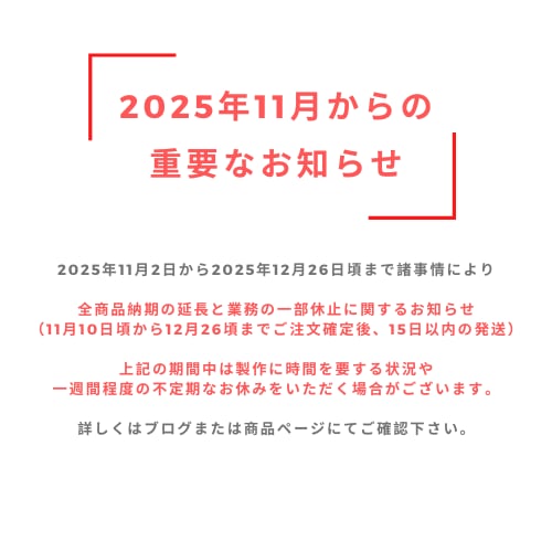 上記の11月11日~12月15日頃の期間中は、製作作業や発送業務を一週間程度のまとまった日数、不定期にお休みさせていただく場合がございます。